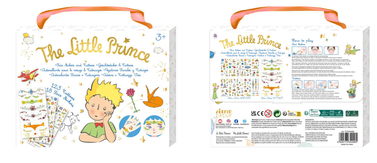 The Little Prince Face Stickers and Tattoos is a playful set for children aged 3 and up, featuring 18 face stickers and 123 temporary tattoos with whimsical designs from The Little Prince. From stars and flowers to the Fox and the Little Prince himself, kids can decorate their skin safely and creatively. Packaged in a handy carry case with a ribbon handle, it??s perfect for parties, dress up, or everyday fun. It encourages self expression, creativity, and imaginative role play all in one delightful and easy to use set.