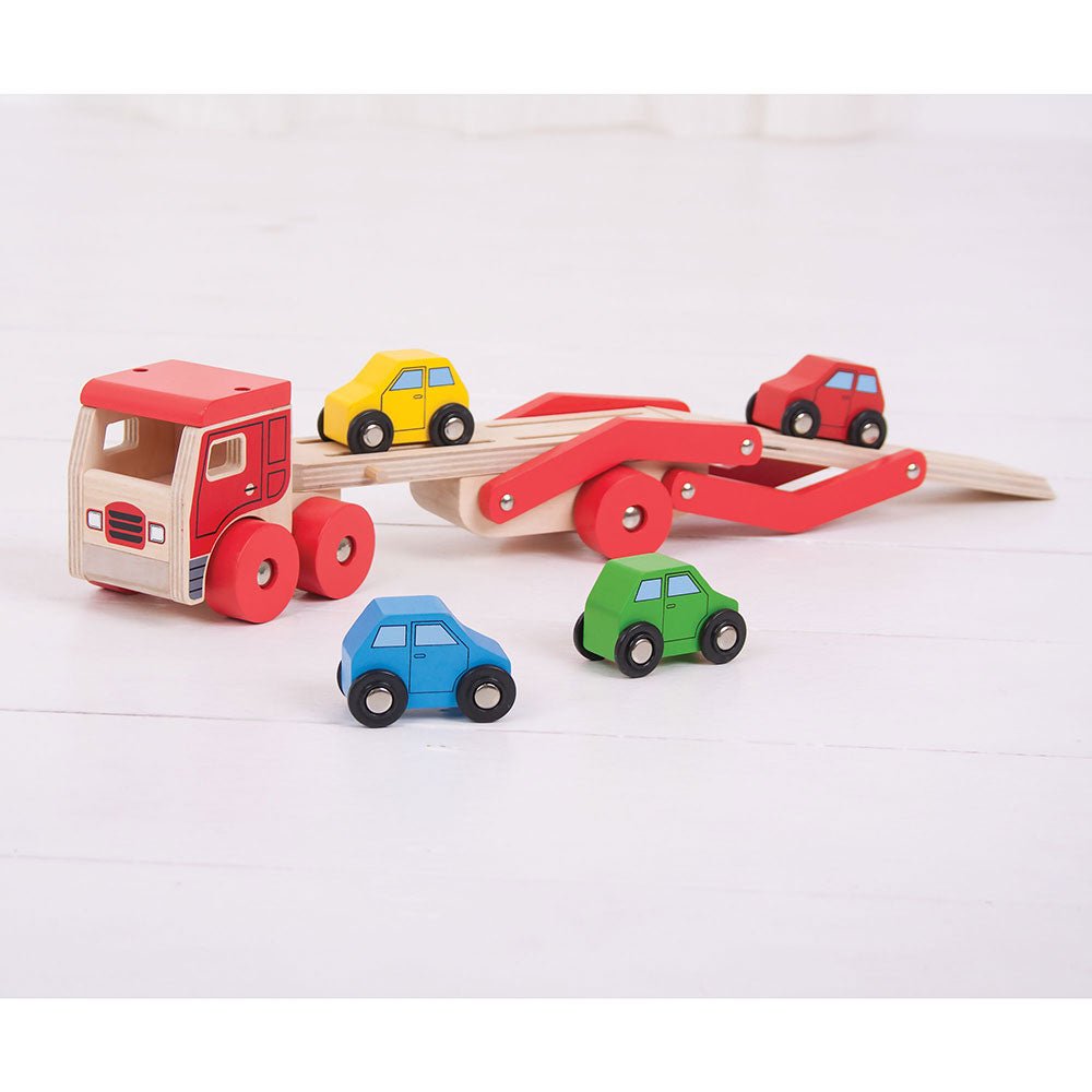 This wooden Transporter Lorry push along helps to develop dexterity and co-ordination and carries a load of four brightly coloured wooden cars. The upper deck can be easily lowered to allow each vehicle to drive on and off and grooves in the surface help to keep each car in place as they’re transported to their destination.