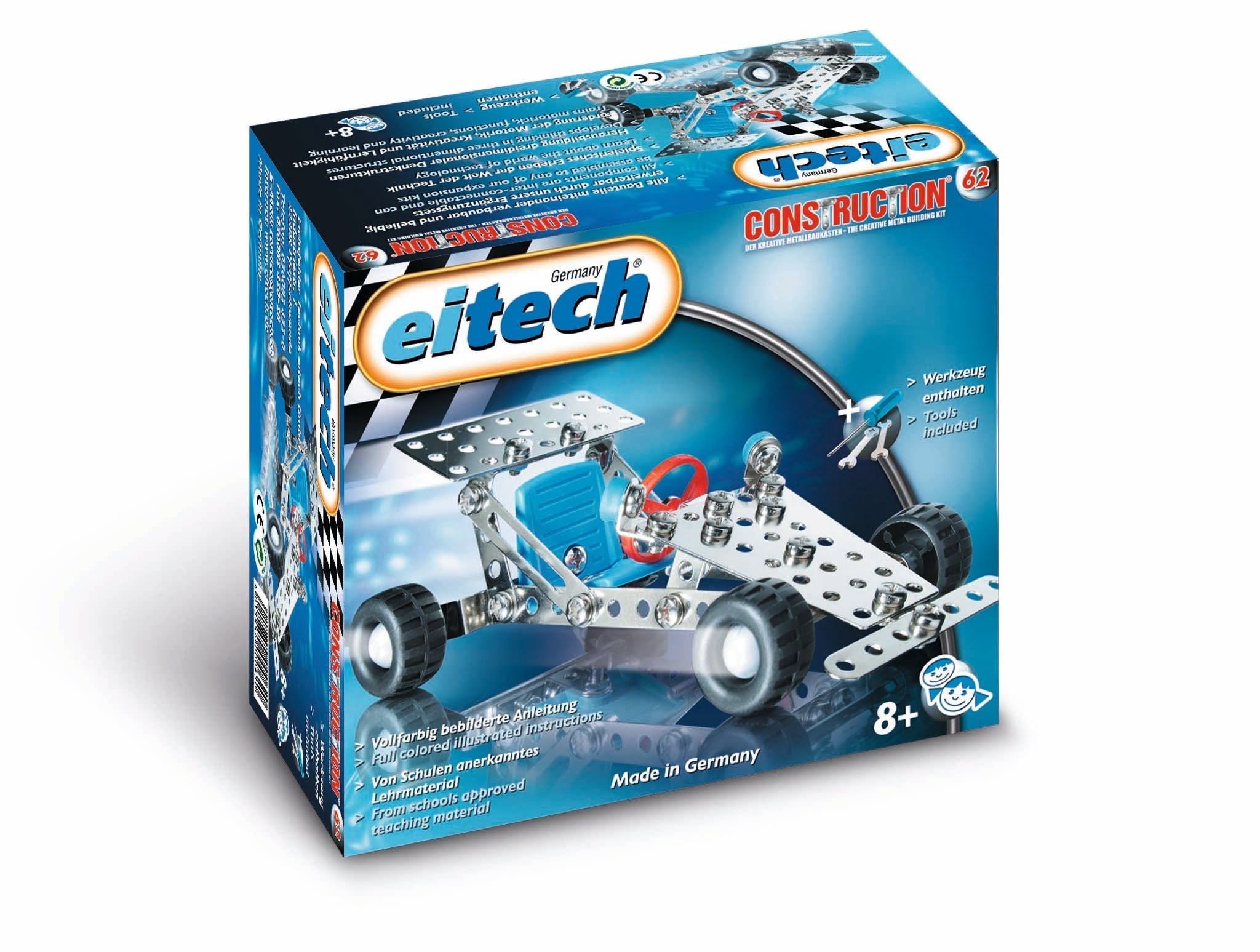 Metal model building sets by Eitech Germany. Fast and powerful, this racing car is the ultimate speed machine. Zoom over any race track and at the same time train up their motor skills and learn how to work with tools. Assembly tools and detailed assembly instructions are included with the building set.