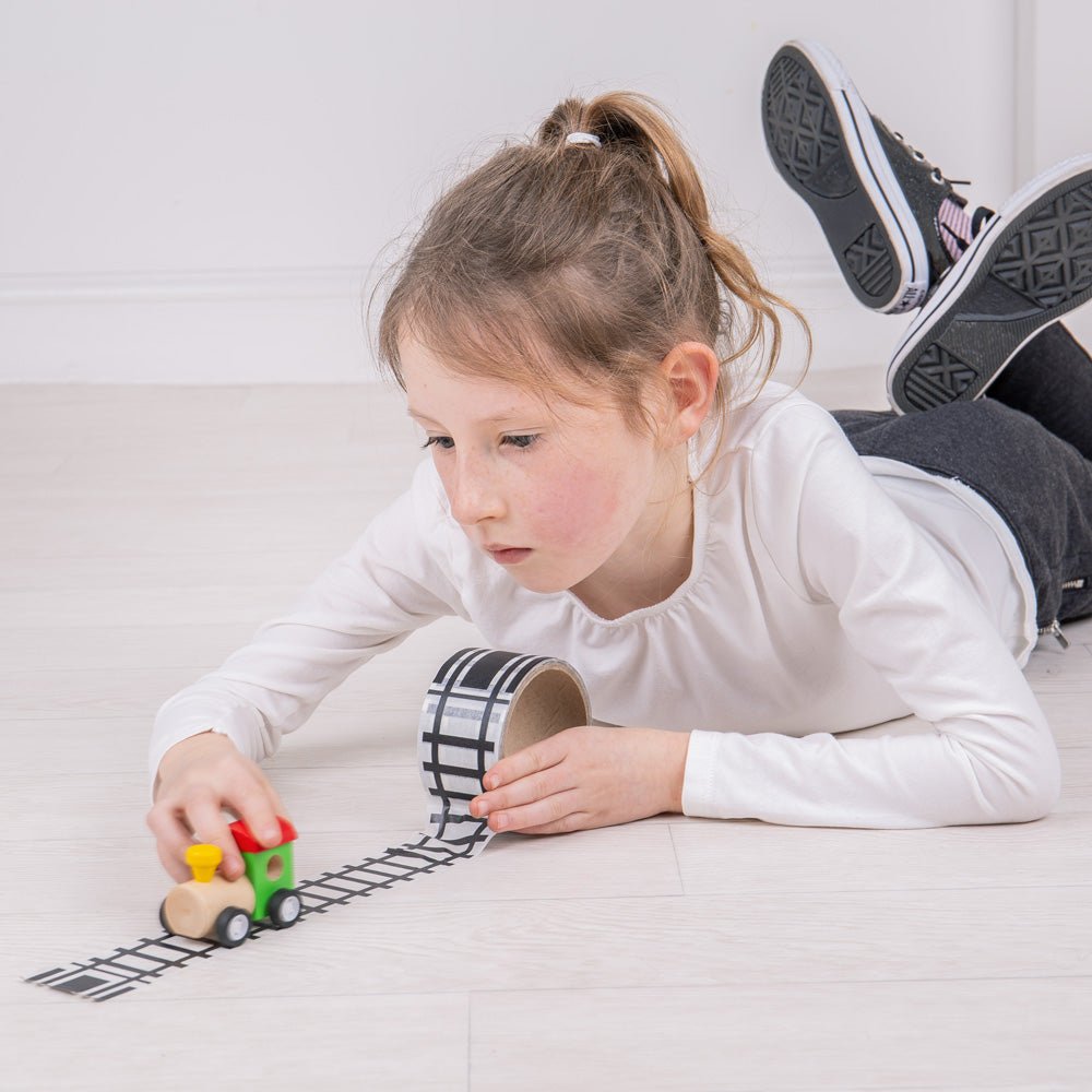 Create a completely new track layout with every play session with this tactile and durable Railway Tape. Easy to use, just simply peel off and stick to a surface. Suitable for floors, walls and furniture. Easy to tear off, the tape will not leave track or residue, and won’t damage the surface. A great way to encourage imaginative role play.