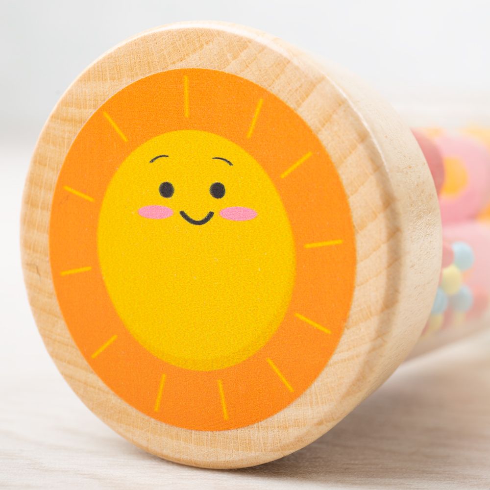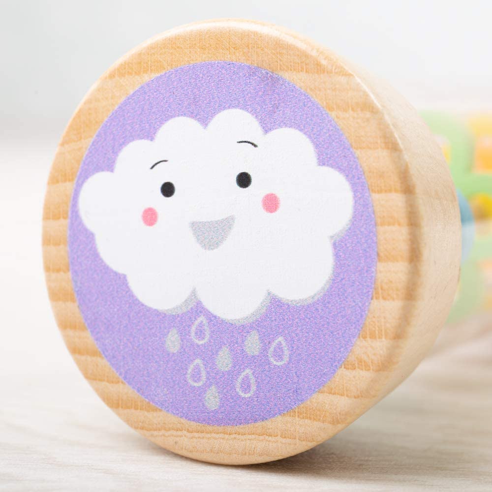This adorable wooden Rainmaker recreates the soft sound of rainfall. As you turn the instrument, the colourful beads will cascade through the tube, creating fascinating sounds and visual effects.